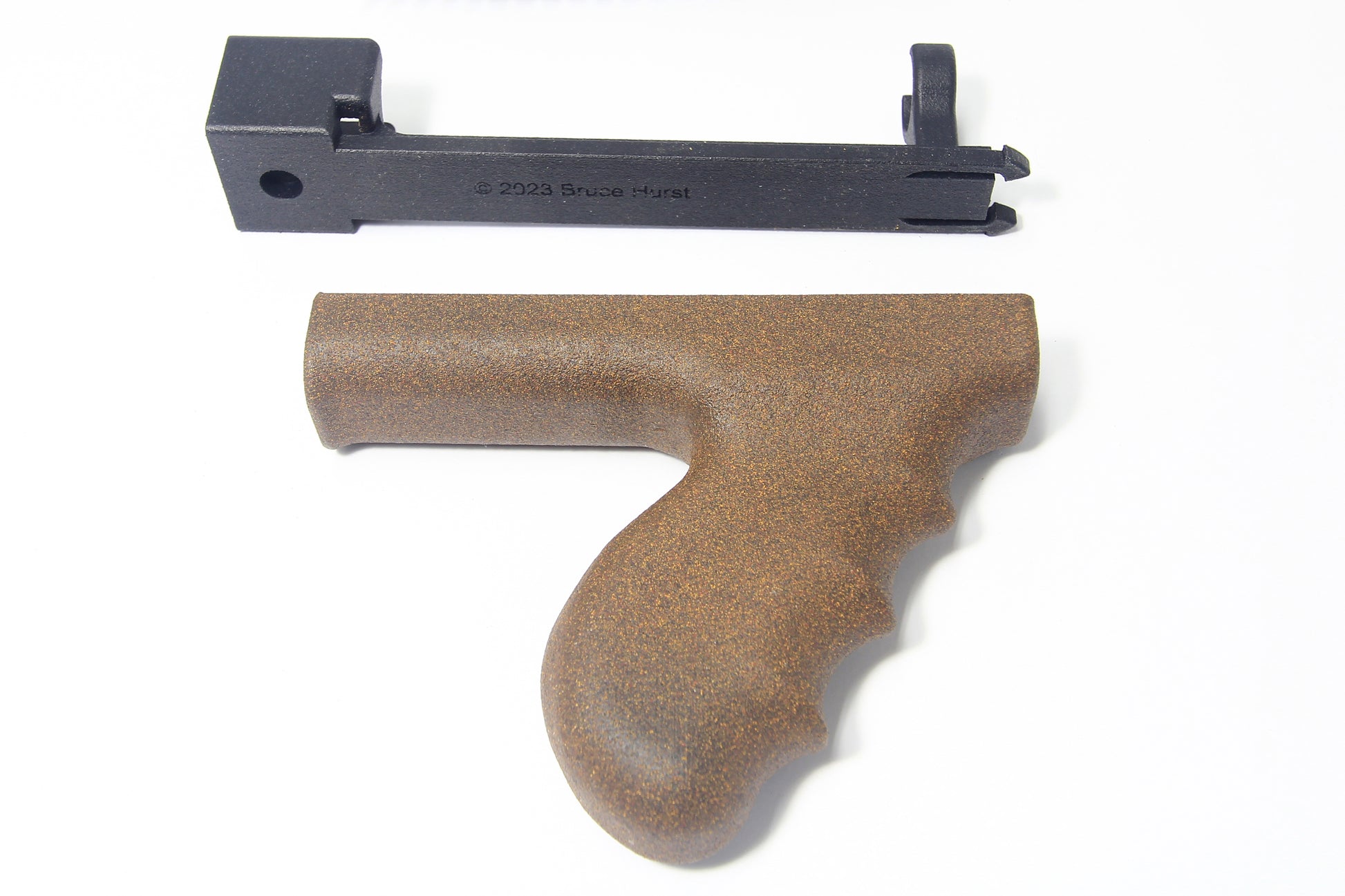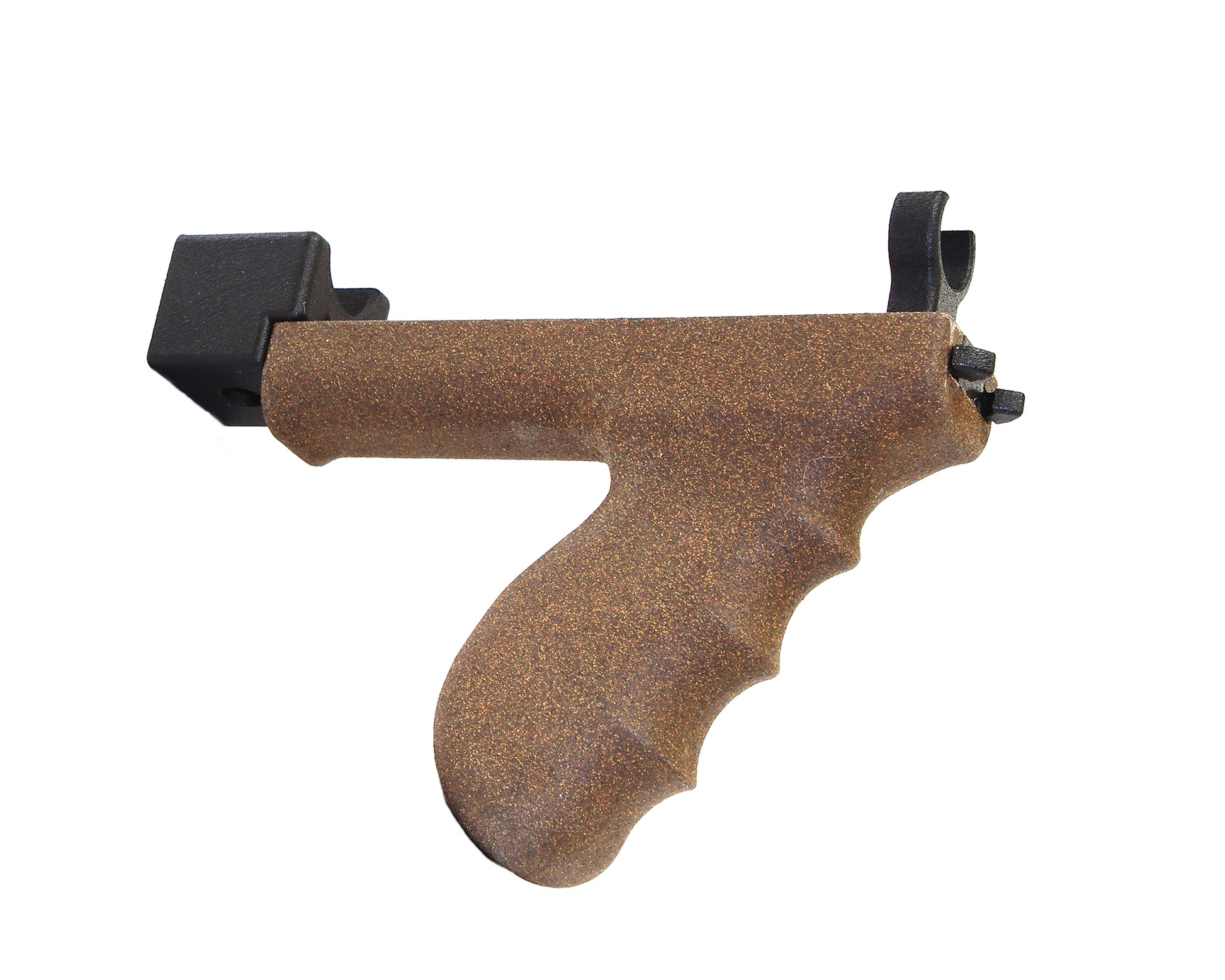 Painted vertical front grip with brown textured finish. Black nylon polymer grip support. The assembly is designed for the grip to easily be removed from its support without tools.